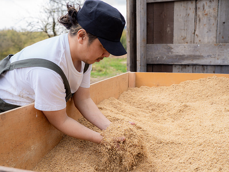 ふじよだ養鶏で生み出される“卵の美味しさ”には、一切の妥協を許さない環境づくりや餌作りに理由があります。“格別な卵の味”を最大限に引き出すために、鶏たちに与える飼料は、すべて手作りで自家配合。牡蠣殻、大麦、ぬか、有機野菜、動物性たんぱく質などを独自にブレンドし、発酵させたものを与えています。鶏の腸内環境を整え、健やかな成長と美味しさを引き出すための工夫です。餌の内容が卵の味や黄身の色に大きく影響するからこそ、日々の観察と調整が欠かせません。